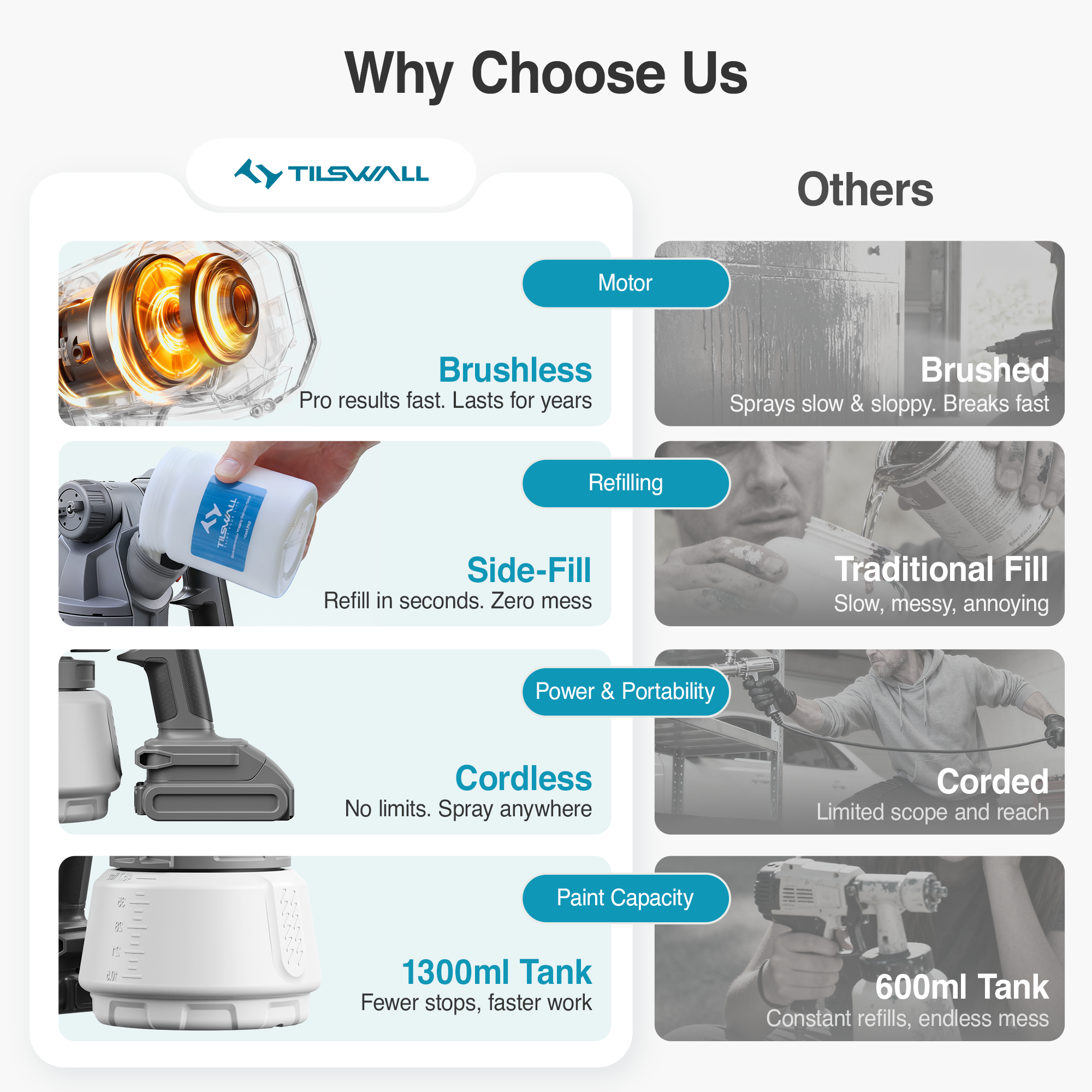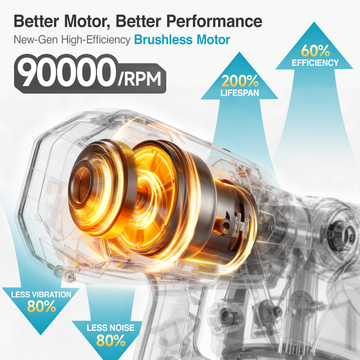 Notre pistolet à peinture est équipé d'un moteur sans balais avancé tournant à 90 000 tr/min. Il garantit une finition lisse, des vibrations et un bruit réduits, ainsi qu'une durabilité accrue. Conseil Pro : En raison du léger délai de démarrage de protection, dirigez la buse loin de la cible. Appuyez légèrement sur la gâchette pendant 2 secondes pour démarrer le moteur, puis à fond pour pulvériser. Ceci évite les éclaboussures initiales et assure un départ parfait.
