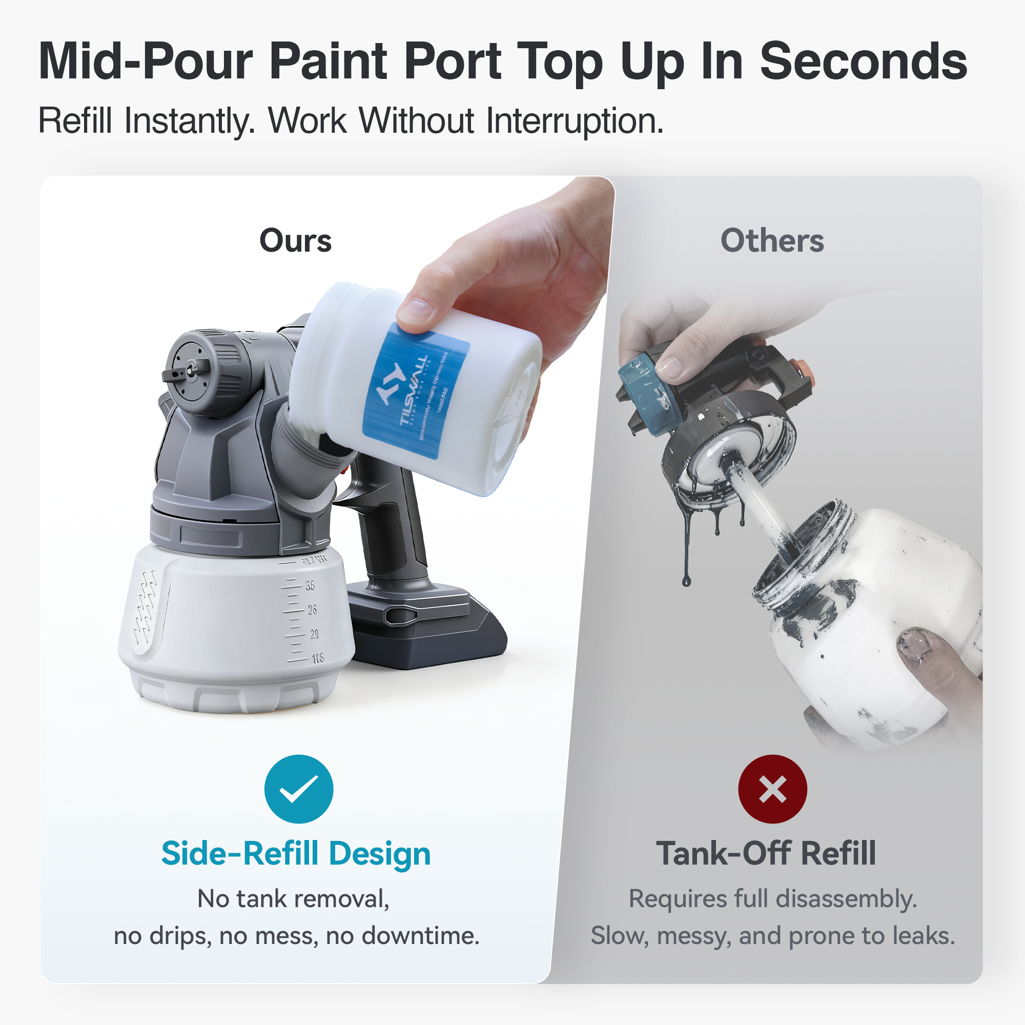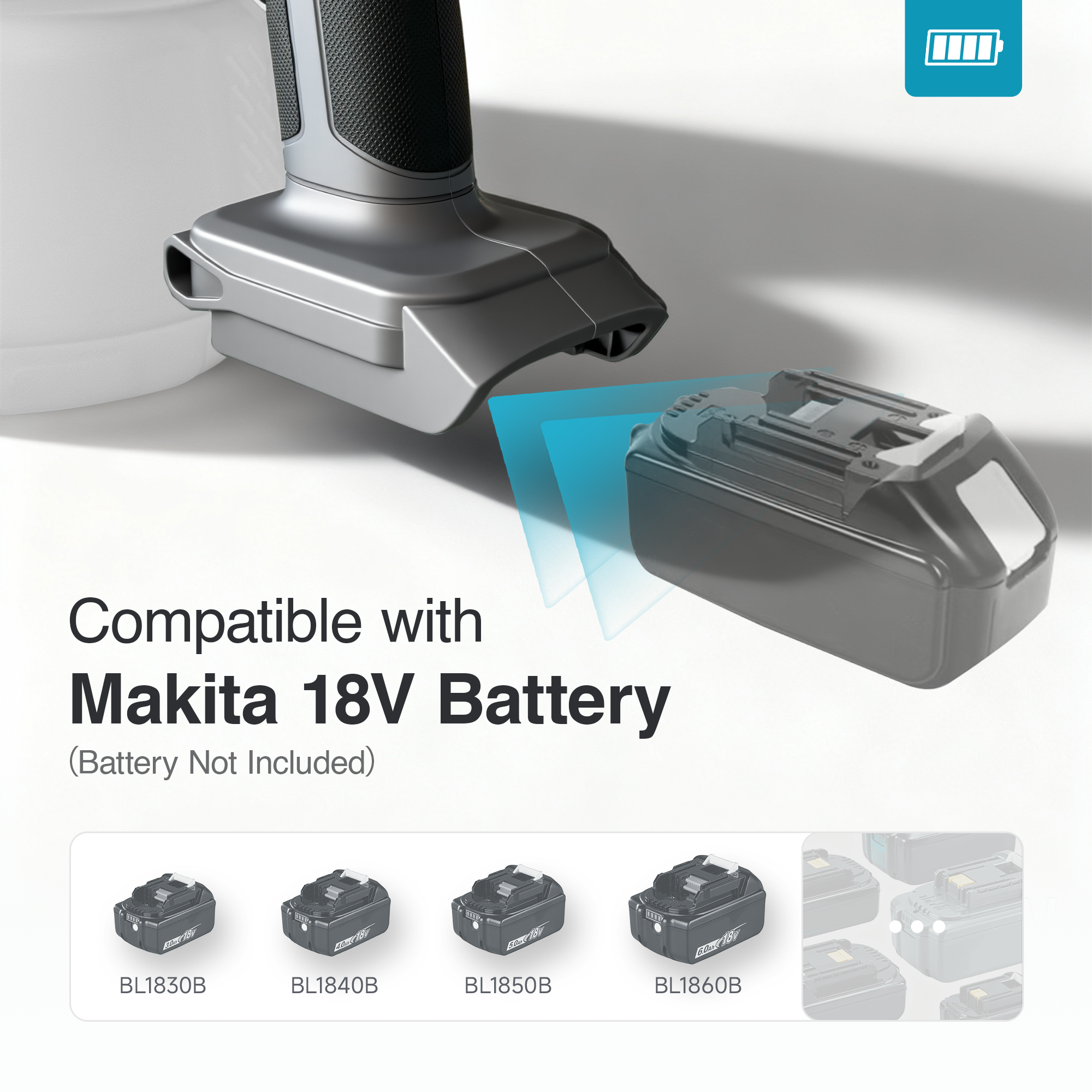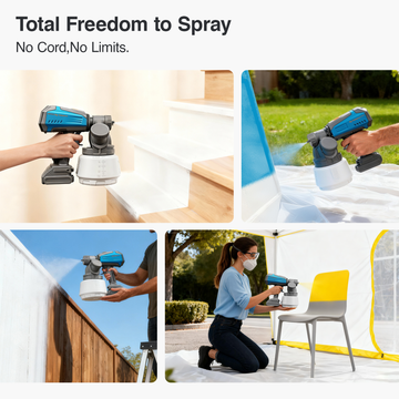 Profitez d'une liberté de mouvement totale avec ce pistolet à peinture sans fil. Il fonctionne avec les batteries Makita 18V compatibles (incluant BL1860B, BL1850B, BL1840B, BL1830B, BL1820B, BL1815N et autres ; batterie non incluse). Idéal pour une grande variété de projets intérieurs et extérieurs : maisons, murs, clôtures, meubles, armoires, portes, garages et tous les endroits où une prise électrique n'est pas accessible.