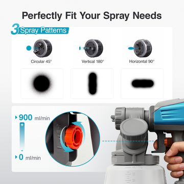 Obtenez des résultats professionnels et personnalisés sur tous vos projets. Ce pistolet à peinture offre trois motifs de pulvérisation (horizontal, vertical, circulaire) et un débit variable (0-900 ml/min) pour s'adapter parfaitement à votre tâche, qu'il s'agisse de finitions délicates sur des meubles ou de couvrir de grandes surfaces murales. Un contrôle essentiel pour tous vos travaux avec des pulvérisateurs de peinture.